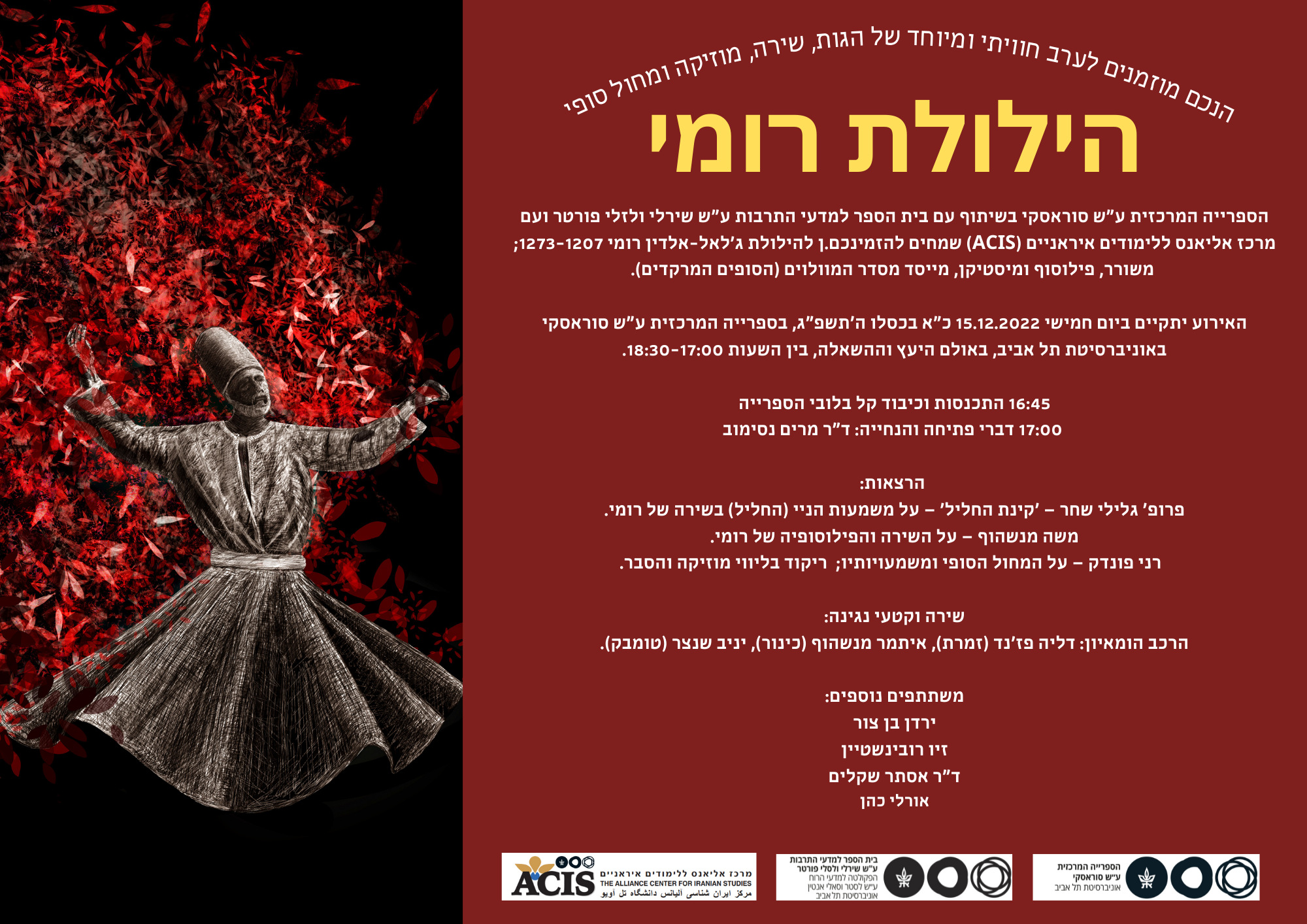 שמחים להזמינכם.ן להילולת ג'לאל-אלדין רומי 1273-1207; משורר, פילוסוף ומיסטיקן, מייסד מסדר המוולוים (הסופים המרקדים).
