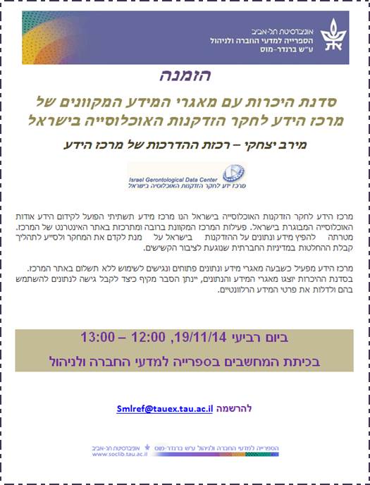 ברצוננו להזמינכם לסדנת היכרות עם מאגרי המידע המקוונים של מרכז הידע לחקר הזדקנות האוכלוסייה בישראל.
